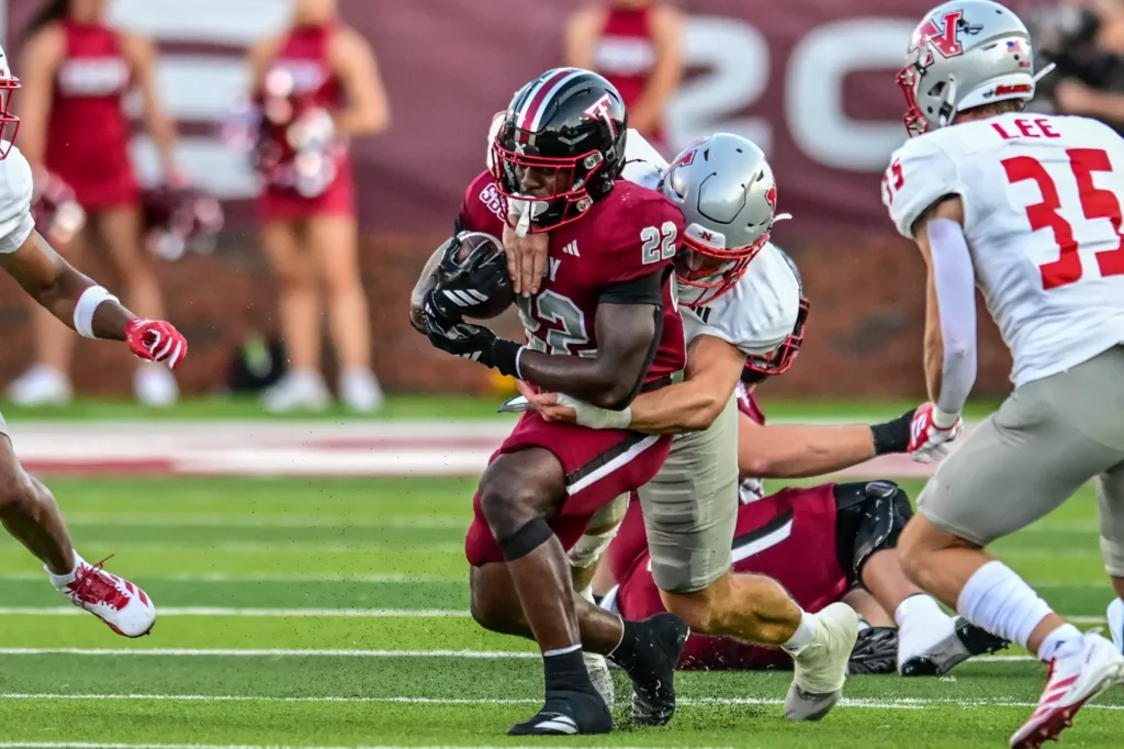 For this one, I think my issue is that the helmet feels incomplete. The jersey and pants have cardinal, white, and black elements in them, but the helmet only has black and white. If cardinal decals or a cardinal facemask were used, I think this combination could’ve ranked much higher. Pairing this look against ULM’s all-black look made for a very bland looking contest.