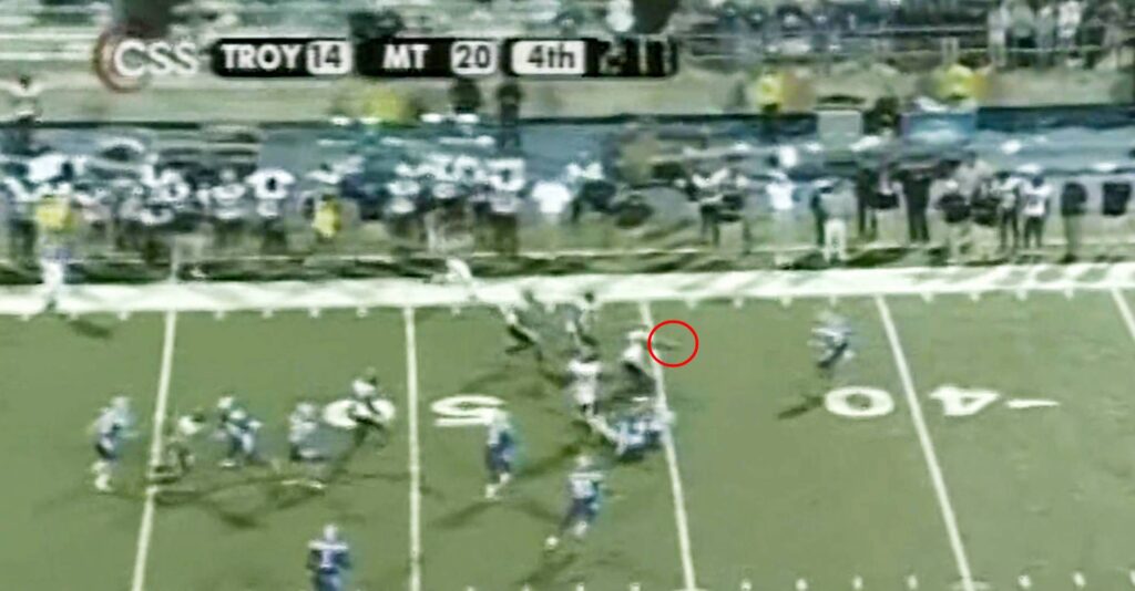 It’s 20-14 MTSU with 2:19 left. Then Troy’s kickoff team lined up with a wall of defenders charging up to the line in a unique onside kick formation I’ve never seen before or since.