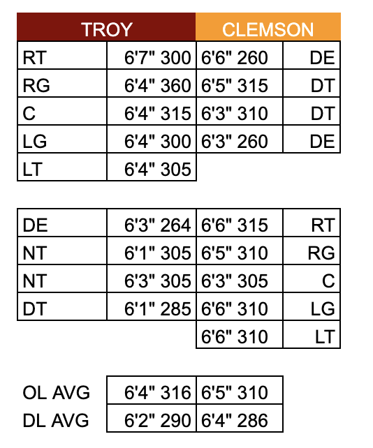 Offensively, Troy matches up not only with Clemson’s defensive line, but also its offensive line. That’s promising for a Troy team built around the run game and struggled with pass rush pressure.